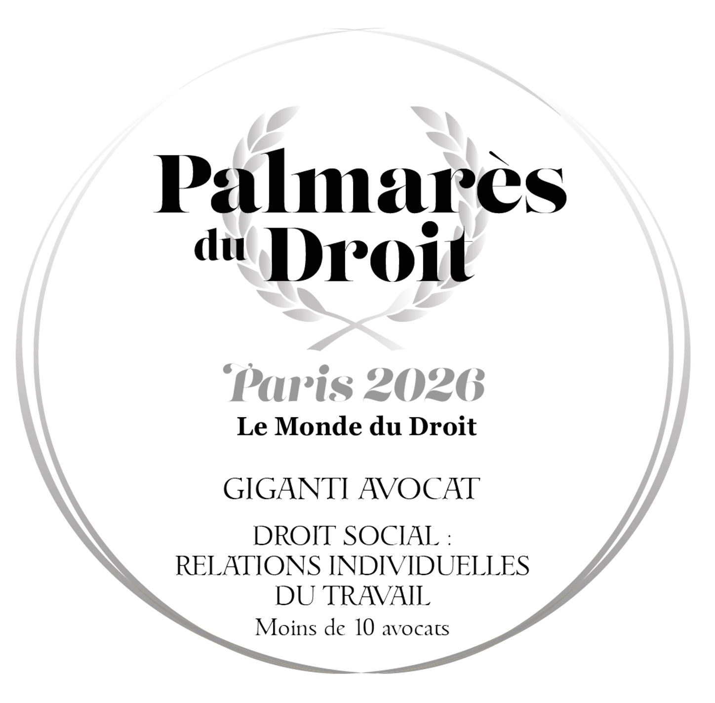 Le cabinet Giganti Avocats a reçu le prix d'argent dans la catégorie Droit social — Relations individuelles du travail lors du Palmarès du Droit 2026, organisé par Le Monde du Droit. Cette distinction, décernée par un jury de directeurs juridiques et de juristes d'entreprise, confirme le positionnement du cabinet parmi les meilleurs avocats en droit du travail à Paris.